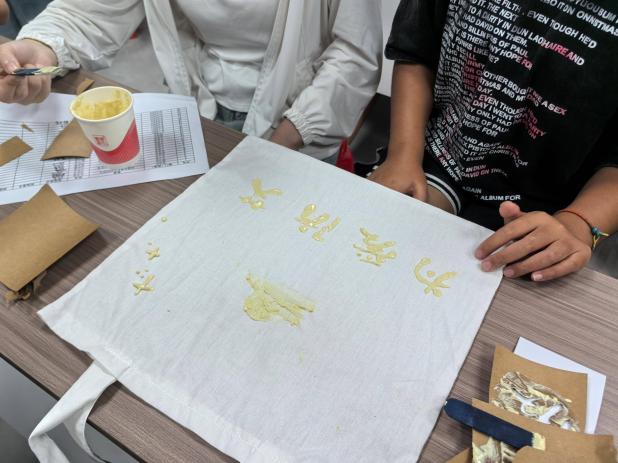 活动现场,学生们积极参与到型糊染的制作过程中。志愿者首先向同学们介绍了型糊染这一传统工艺的历史背景和操作技巧,并指导大家在白坯布包上进行创作。每位参与者都亲手设计并染制了带有防艾宣传标语的布包,如“为爱防艾”、“健康生活,远离艾滋”等。这些作品不仅展示了学生们的创意与动手能力,更承载着他们对防艾事业的支持与呼吁。