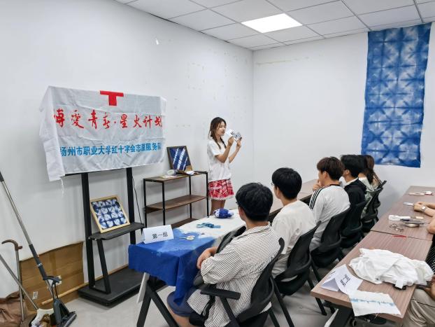 近日,扬州职业技术大学纺织服装学院在高邮湖校区“一站式”学生社区给大一新生开展了一场别开生面的防艾宣传教育活动。此次活动是学院参与省红十字会“博爱青春·星火计划”的重要组成部分,通过将传统型糊染技艺与防艾宣传相结合,创新性地提升了宣传效果。