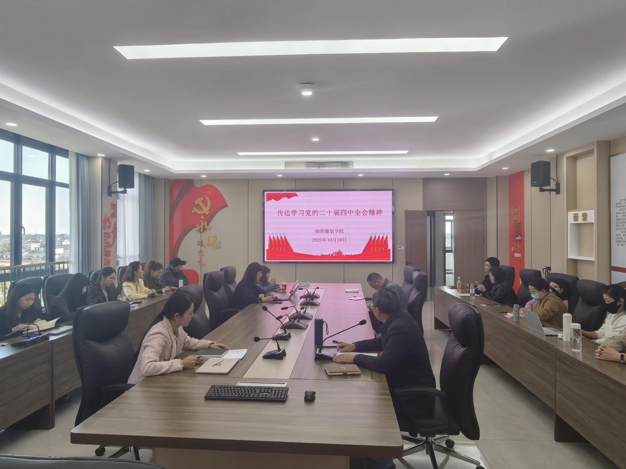 2025年10月29日,纺服学院召开全体教职工会议,传达学习党的二十届四中全会精神,落实中央部署和省委、市委、学校党委要求,研究贯彻落实举措。会议由党总支书记主持,班子成员和全体教职工参加。
